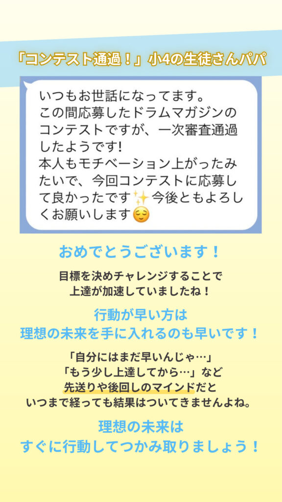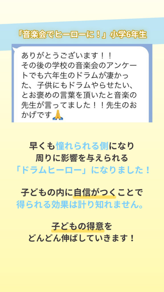 ピアノを習わせていたときはレッスン前になっても嫌がって練習しなかったのに、ドラムを習い始めたら毎日楽しそうに練習しています。もともと身体を動かすのが好きだから合っていたようです。吹奏楽では色々なジャンルの曲を演奏するので、親身に相談にのっていただき助かっています。
